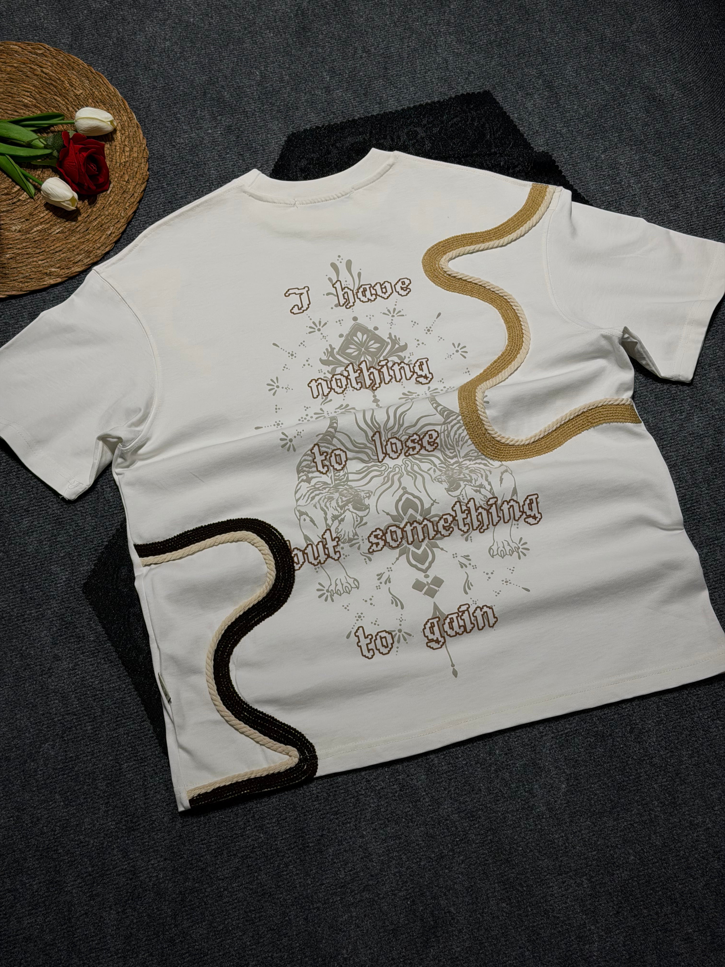 Hasır Şerit Detaylı Kaplan Baskılı Oversize T-shirt Beyza