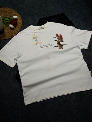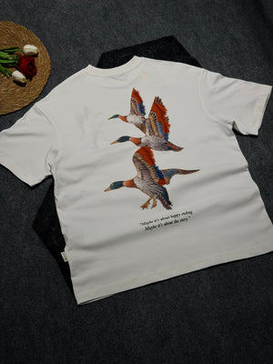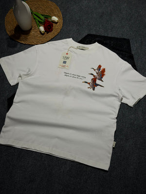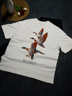 Yaban Ördeği Kadife Baskılı Oversize T-shirt Beyaz